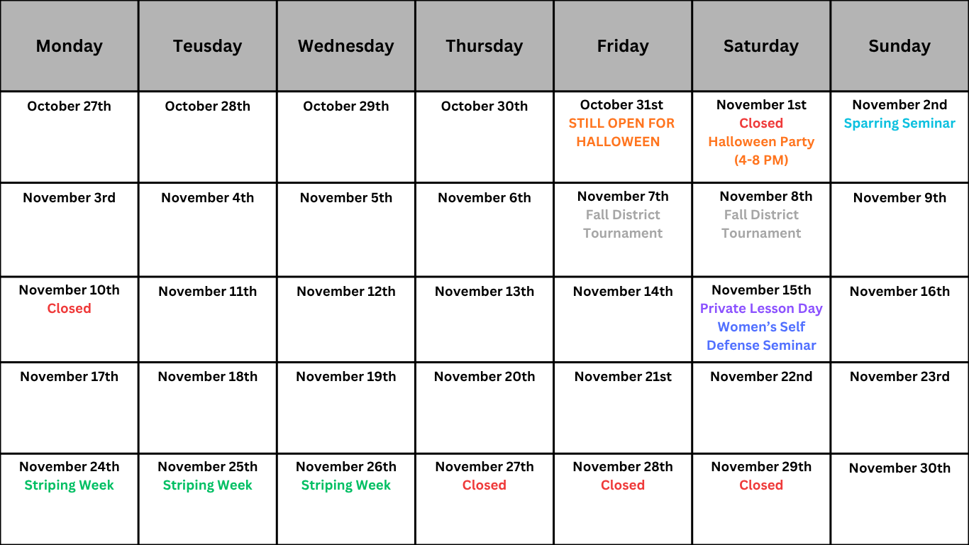 New students start at White Belt. Classes are split by belt color for Juniors (Ages 6-11). Teen and Adult classes are all ranks.